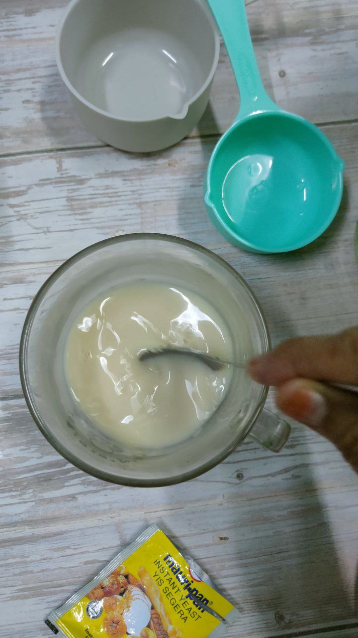 Bancuh yis dengan air suam dan sedikit gula. Kacau-kacau untuk sebatikan ramuan. Rehatkan.